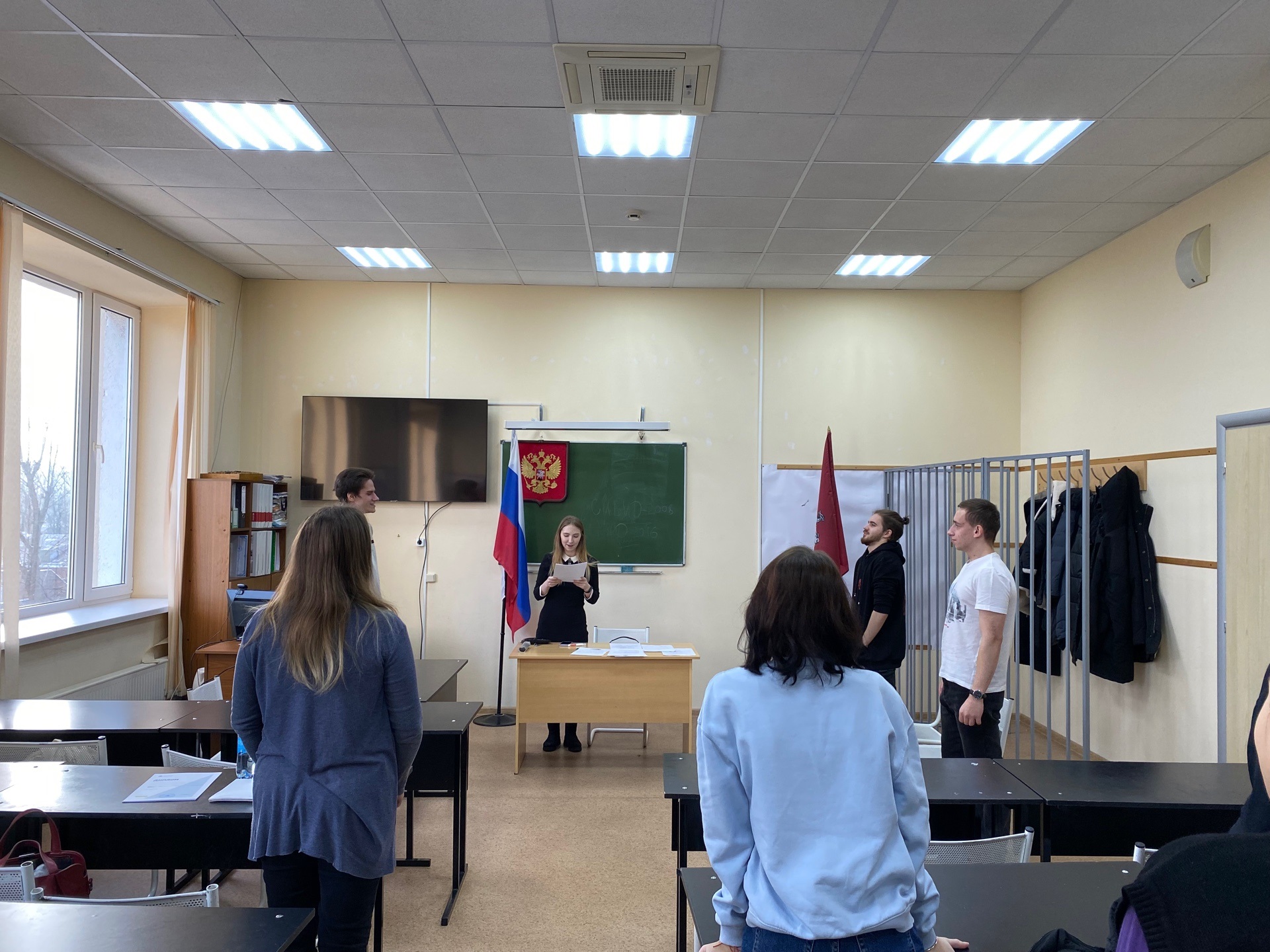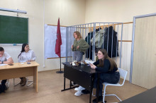 Вначале было разыграно судебное заседание по трудовому спору, в котором приняли участие студенты 1 и 4 курсов, обучающихся по направлениям: гражданско-правовой и уголовно-правовой профили. С целью передачи полученных знаний и приобретенного опыта каждому первокурснику был назначен куратор из числа будущих выпускников, студентов 4-го курса. Старшекурсники помогали младшим коллегам составлять процессуальные документы, аргументировать поддерживаемую ими позицию и готовить доказательную базу. Студенты выполняли роли истца и ответчика, а также их представителей, судьи и судебного секретаря, инспектора по охране труда, медицинского эксперта и свидетеля.