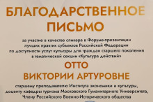 29 октября прошел Форум-презентация лучших практик субъектов Российской Федерации по доступности услуг культуры для граждан старшего поколения «Без границ сквозь поколения». Организаторы Форума: Министерство культуры Российской Федерации. Преподаватель кафедры туризма Отто Виктория Артуровна выступила в тематической секции №2. «Культура действий»: рекомендации, способствующих обеспечению получения гражданами старшего поколения доступных и качественных услуг в соответствии с их нуждаемостью. Тема доклада: «Культурно-познавательный досуг граждан старшего поколения. Проблемы и перспективы развития».