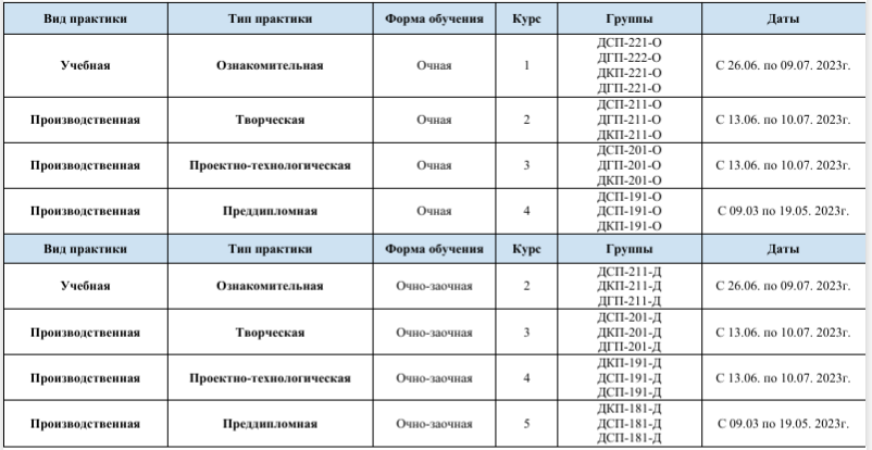 График прохождения практик направления подготовки 54.03.01 «Дизайн»