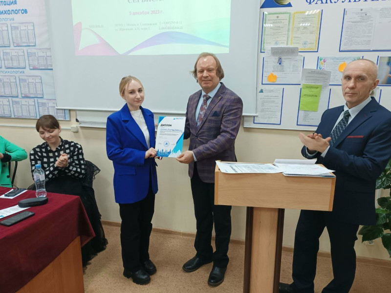 дипломы получили Безрукова Полина Евгеньевна (ПСП-221-О), Мясникова Вера Николаевна (ПСП-221-О), Николаева Любовь Сергеевна (ПСП-221-О) – доклад по теме «Моделирование профессиональной деятельности психолога посредством интерактивной игры» (научный руководитель Е.Н. Сапьяник).