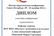 С 9 по 10 декабря 2014 года в г. Санкт-Петербург прошла Международная научно-практическая конференция на тему: «Государственное и общественное регулирование и поддержка сферы туризма». От нашего ВУЗа активное участие в работе конференции приняли: заведующая кафедрой туризма Моисеева Мария Сергеевна, профессор кафедры туризма Ткалич Алексей Иванович и доцент кафедры туризма Сазбандян Тамара Валерьевна.