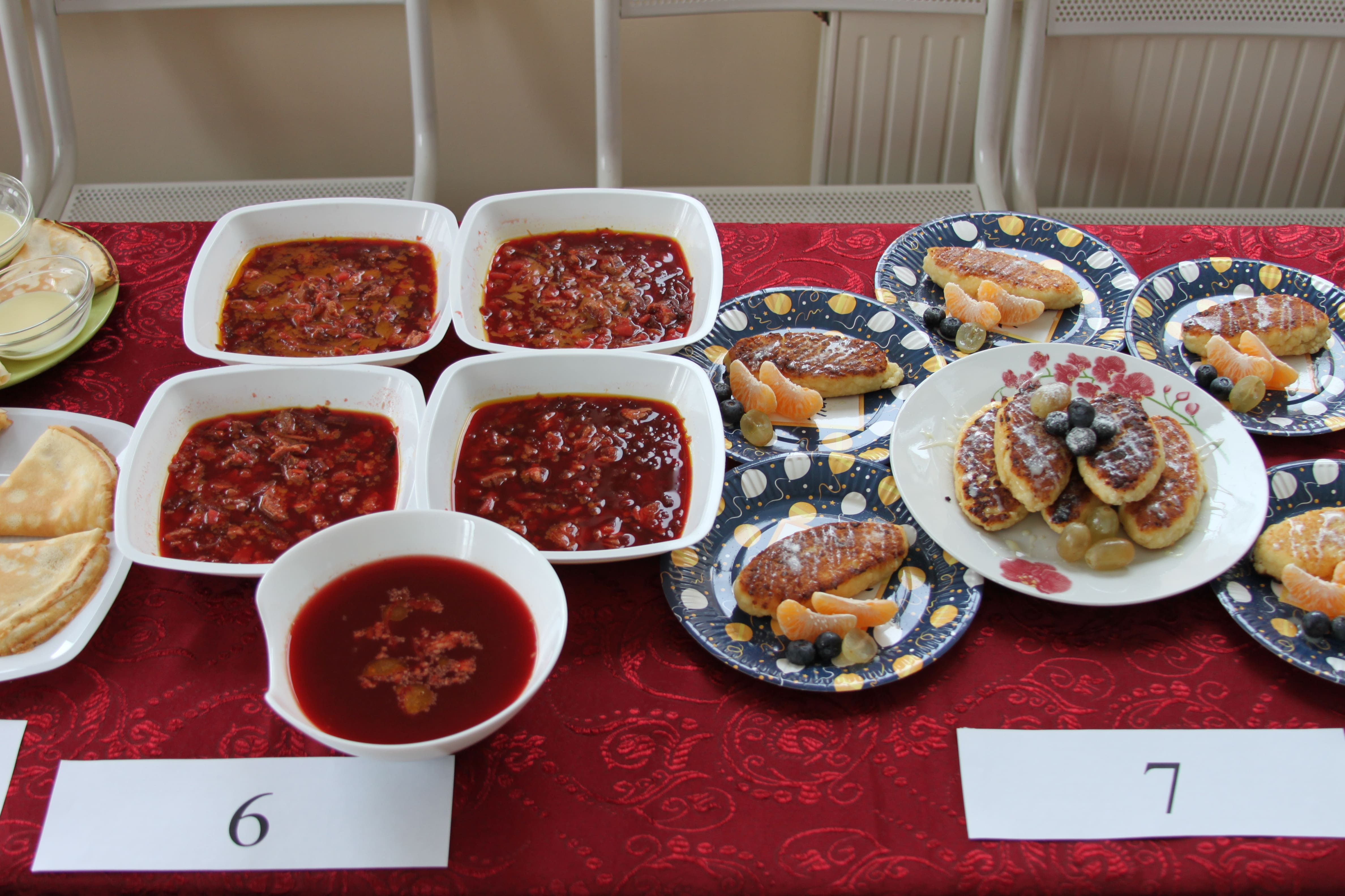 Жестких рамок оргкомитет не ставил, участники воспользовались этим: получившееся меню отличалось разнообразием и национальным колоритом – помимо всевозможных блинов со сладкими и солёными начинками, были представлены белорусские зразы, грузинская када, медовик и даже борщ!
