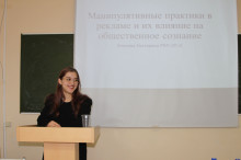 Следующими выступали студенты третьего курса, проводившие исследования в рамках своих курсовых работ и самостоятельных исследований. Особенно запомнились выступления, посвящённые современным рекламным и PR-кампаниям в интернет-пространстве, инновационным технологиям в рекламе, а также проблеме освещения в СМИ политических инфоповодов.