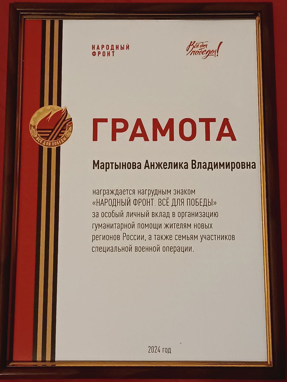 На форуме #МыВместе, который проходил 4-8 декабря 2024 года в Москве, была награждена старший преподаватель кафедры сервиса - Мартынова Анжелика Владимировна нагрудным знаком "Народный фронт. Все для Победы", за особый личный вклад в организацию и развитие гуманитарной помощи жителям новых регионов России.