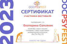 В рамках совершенствования профессионального мастерства в ноябре 2023 года старший преподаватель кафедры психологии Сапьяник Екатерина Николаевна приняла участие в ежегодном семидневном IV-онлайн фестивале доказательной психологии «ДОКПСИФЕСТ ‘23». Это мероприятие стало знаковым для психологического сообщества, поскольку оно позволяет познакомиться с инновационными тенденциями и методами работы в области психологической науки, а также обменяться опытом с более чем 50 ведущими специалистами и экспертами.