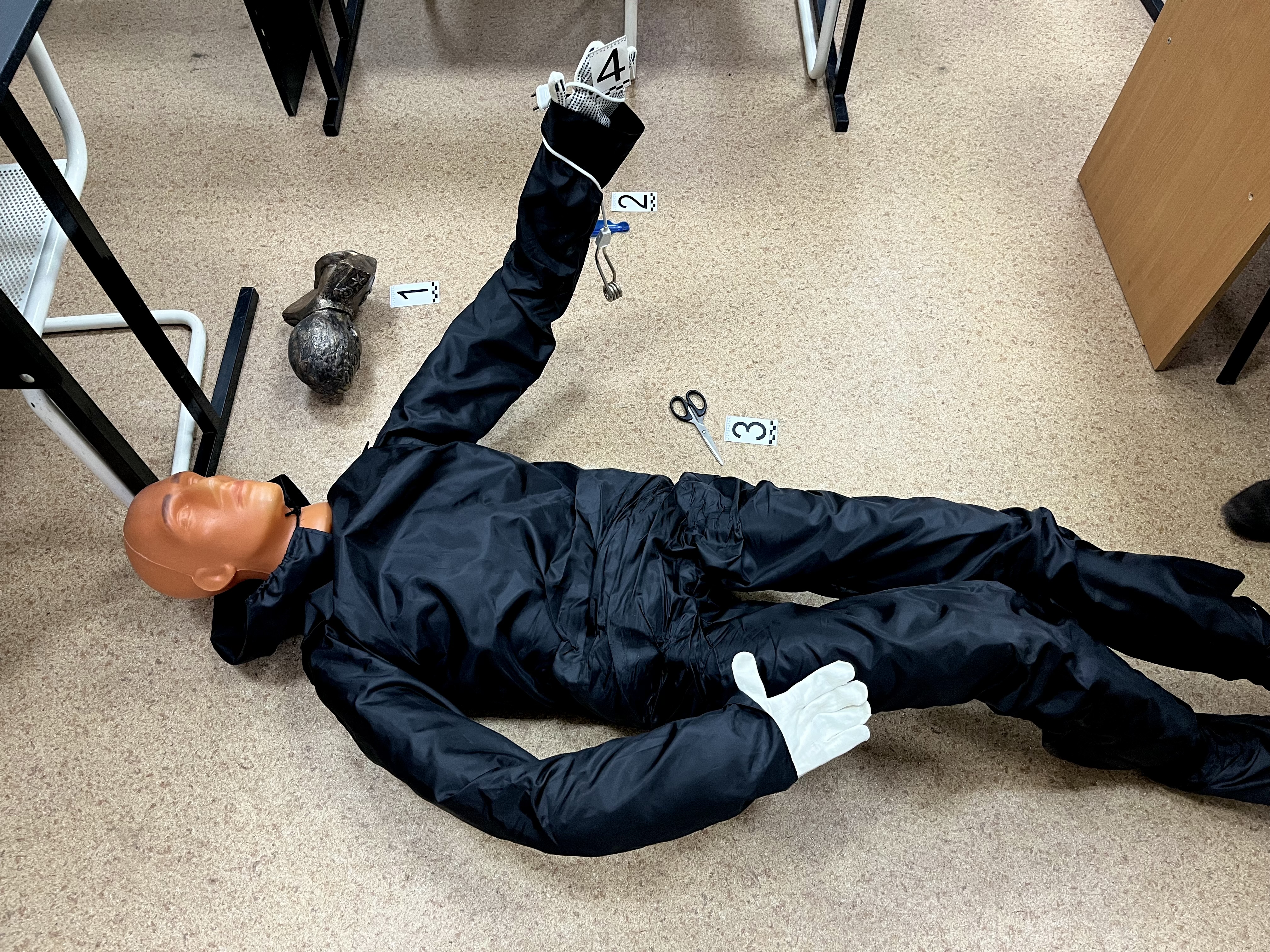 Семинар включал в себя имитацию места преступления, в комплекте с манекеном «жертва» и размещенными доказательствами. Студентам было поручено тщательно изучить место происшествия, задокументировать свои выводы и собрать потенциальные судебно-медицинские доказательства.