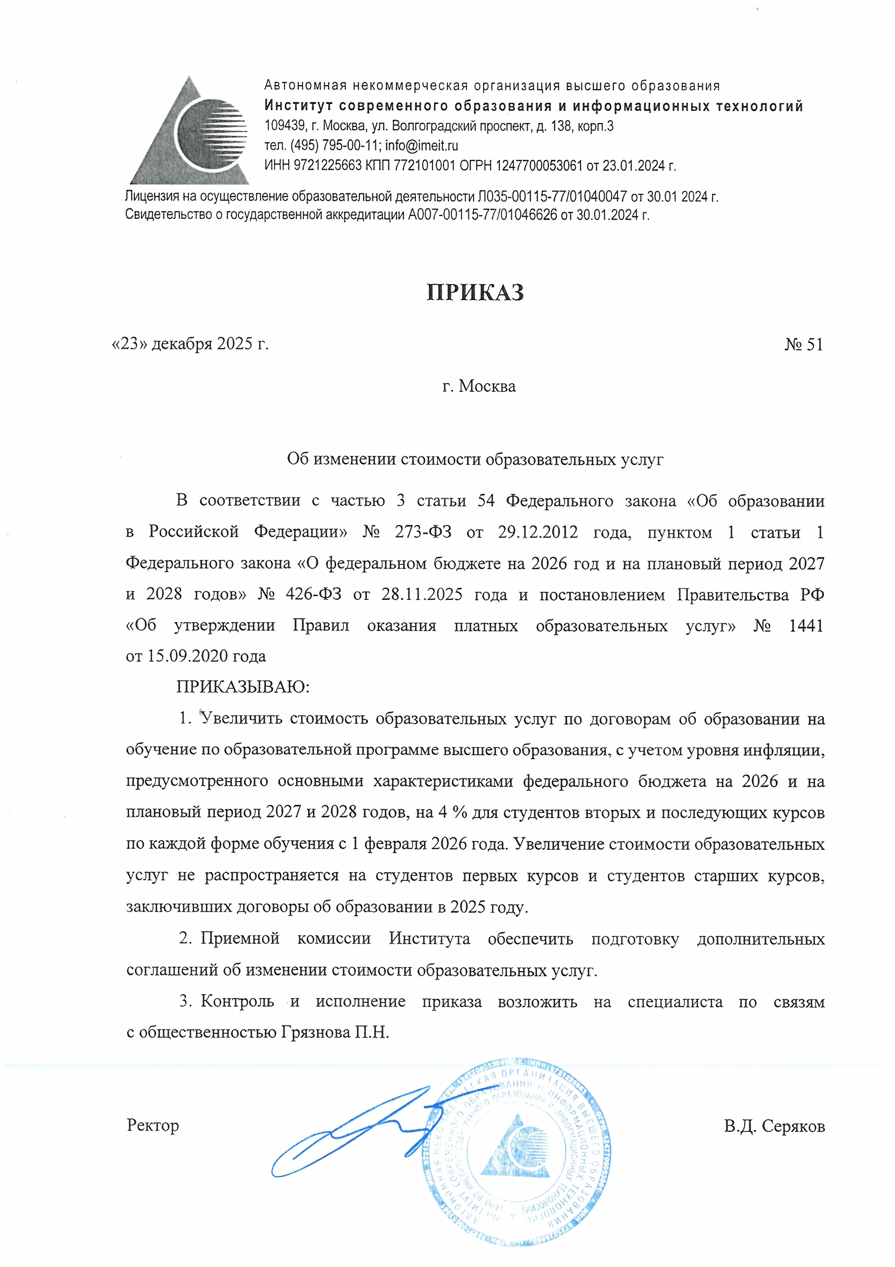 Приказ № 51 от 23.12.2025 года "Об изменении стоимости образовательных услуг"