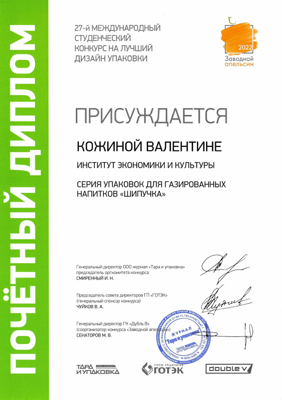 Студенты направления подготовки «Графический дизайн» нашего института традиционно завоевали призовые места в этом престижном конкурсе. Высокое жюри по достоинству оценило работы Светланы Брежневой (2 место в номинации «Этикетка»), Екатерины Яковлевой (3 место в номинации «Упаковка для ECOLEAN»), Аланы Айларовой (Лауреат конкурса) и Валентины Кожиной (Дипломант конкурса), а также старшего преподавателя кафедры Дизайна Чумаковой Ольги Владимировны.