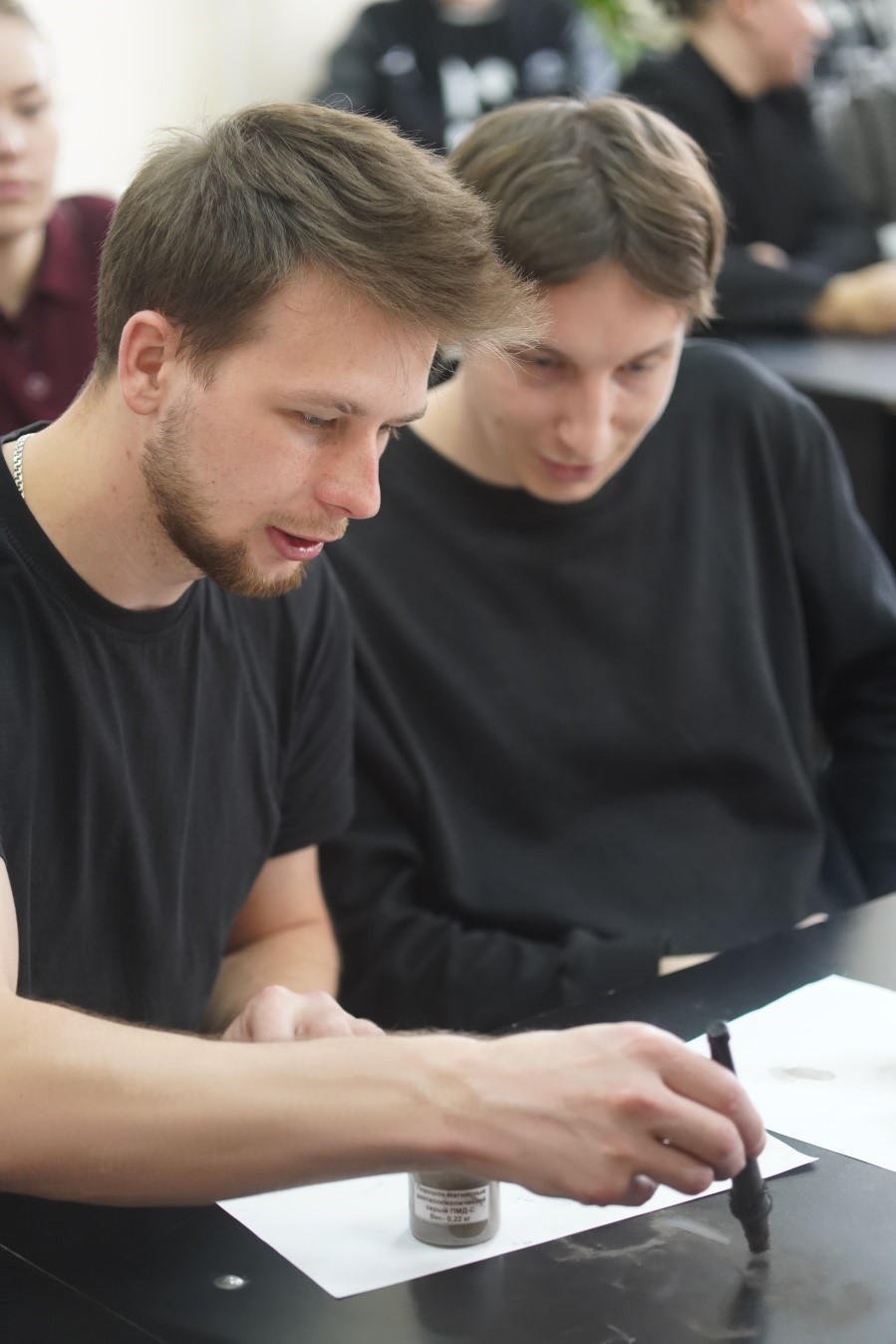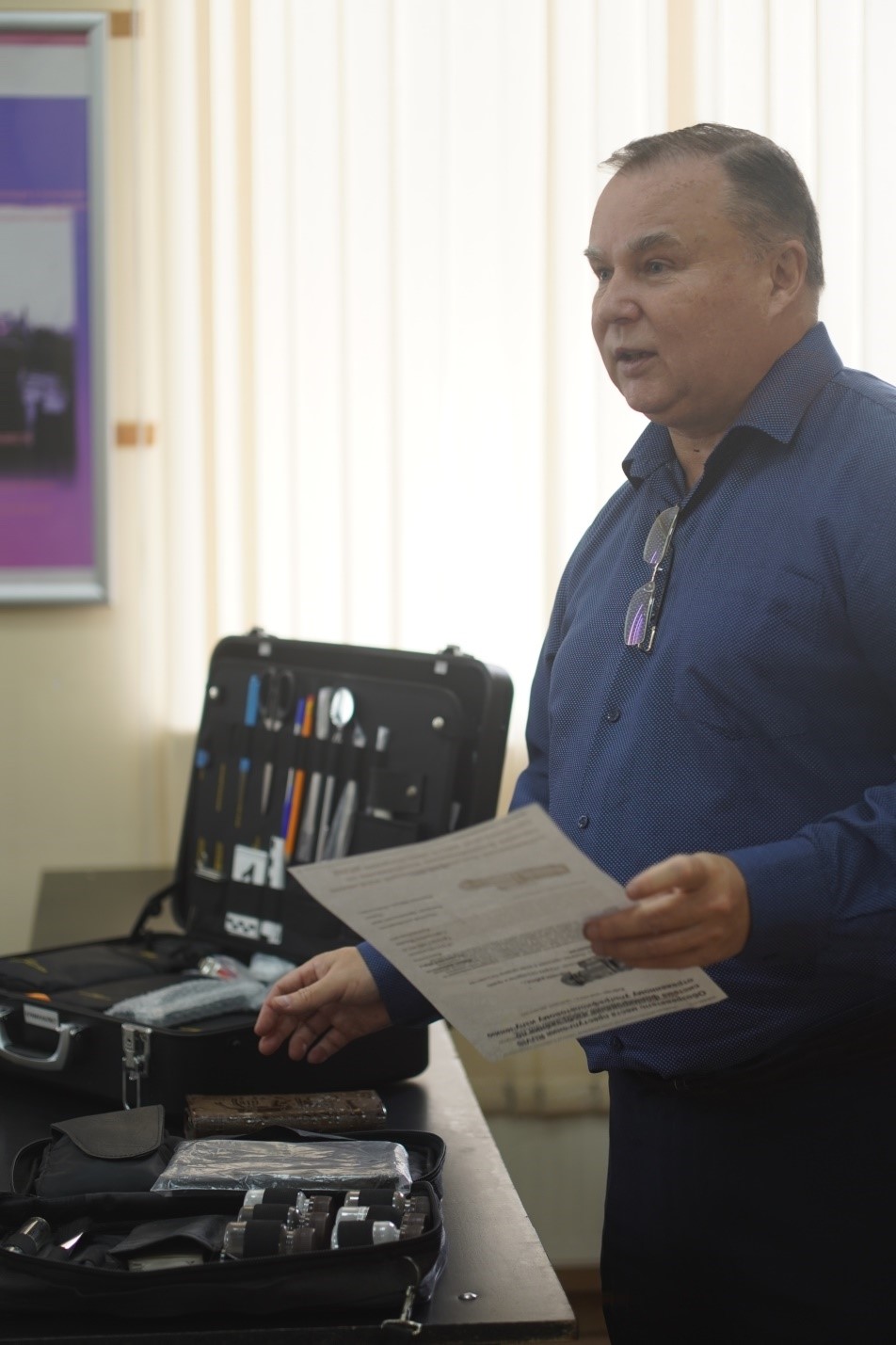 Заведующий кафедрой УПД Никитин Михаил Николаевич продемонстрировал студентам методы снятия отпечатков пальцев, подробно объясняя тонкости работы с криминалистическим оборудованием и специфику фиксации таких следов. Он показал, как правильно использовать кисточки и порошки для выявления отпечатков, а также методы их документирования для дальнейшего анализа.