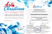 Международный конкурс-фестиваль рождественского и новогоднего праздничного искусства "Арт-Рождество", где были представлены творческие работы - живопись, графика, скульптура, декоративно-прикладные работы, текстиль, фотографии, акварели и сухой пастели, и анимационные ролики, в основе которых прослеживается тема Рождества и Нового Года проходил в г. Москве с 25 декабря 2021 по 8 января 2022 года.