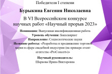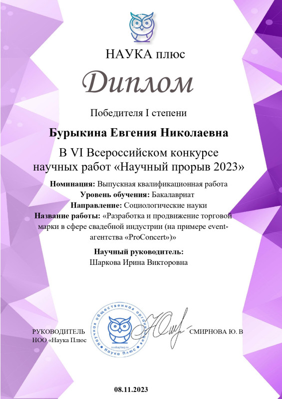 1 место. Бурыкина Евгения с темой ВКР «Разработка и продвижение торговой марки в сфере свадебной индустрии (на примере event-агентства ProConcert)»