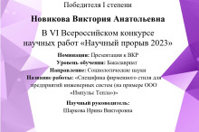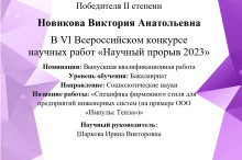 1 место. Новикова Виктория с презентацией к ВКР на тему «Специфика фирменного стиля для предприятий инженерных систем (на примере ООО «Импульс Тепла»)»