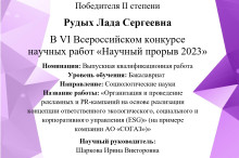 - Рудых Лада с темой ВКР «Организация и проведение рекламных и PR-кампаний на основе реализации концепции ответственного экологического, социального и корпоративного управления (ESG) (на примере компании АО СОГАЗ)»