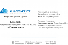 Студентами кафедры туризма был выбран кейс №2 «Универсальный туристический комплекс «Южная ночь», главными задачами которого являлось: 1. Оценка туристского потенциала туркомплекса «Южная ночь»; 2. Определение направлений и объемов финансирования в туркомплекс «Южная ночь», исходя из следующего подхода «минимум средств - максимальный эффект»; 3. Разработка маркетинговой стратегии продвижения туристического комплекса «Южная ночь».