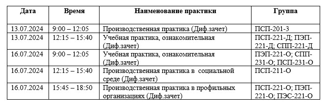 Кафедра психологии обращает внимание: в июле состоится сдача учебной и производственной практик в аудитории №610 для следующих групп: ПСП-201-3, ПСП-201-Д, ПСП-211-О, ПСП-221-Д, ПСП-231-О, ПСС-221-Д, ПЭП-221-Д, ПЭП-221-О, СПП-221-Д, СПП-231-О и ПЭС-221-О.